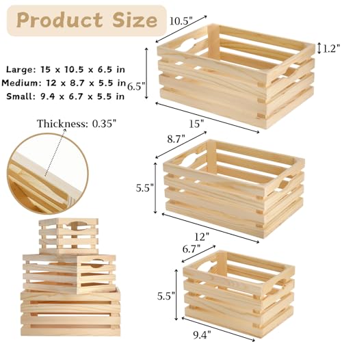 ZENFUN set of 3 farmhouse wooden crates with cutout handles, come with 3 sizes: Large Crate 15 L x 10.5 W x 6.5 H, Medium 12 L x 8.7 W x 5.5 H, Small 9.4 L x 6.7 W x 5.5 H, decorative, practical and portable.