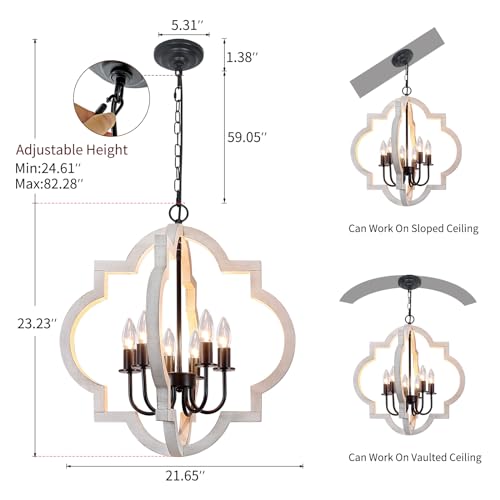 【𝐇𝐞𝐢𝐠𝐡𝐭 𝐀𝐝𝐣𝐮𝐬𝐭𝐚𝐛𝐥𝐞 & 𝐏𝐞𝐫𝐟𝐞𝐜𝐭 𝐒𝐢𝐳𝐞】Rustic farmhouse chandelier has an adjustable 59.05” iron chain, you can adjust the hanging height as your need. Hanging Lamp: 21.65” width x 23.23” Lamp height x Overall Length (82.28 in). No matter low/high ceiling or sloped/vaulted/flat ceiling, this white farmhouse chandelier will meet all your needs.