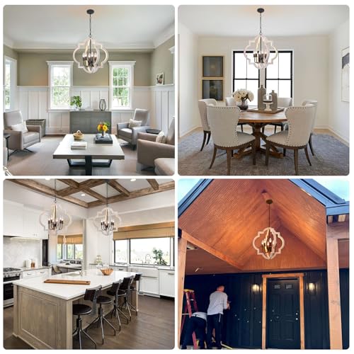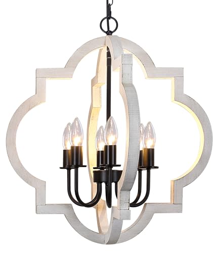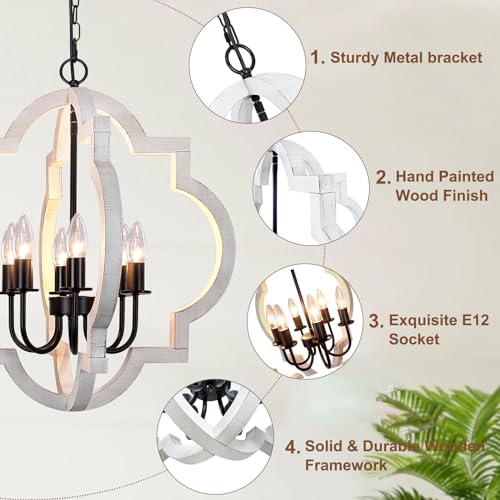 【𝐇𝐚𝐧𝐝𝐜𝐫𝐚𝐟𝐭𝐞𝐝 𝐖𝐨𝐨𝐝 𝐂𝐡𝐚𝐧𝐝𝐞𝐥𝐢𝐞𝐫𝐬】This white orb chandelier with an openwork quatrefoil oak and hand-painted distressed white finish, presents a classic yet rustic farmhouse aesthetics. Never need to worry about fading or rust. The sturdy wood makes it work for years without breaking. when you turn on the light, it creat a warm atmosphere for your home and brings a elegant and vintage feeling to you.