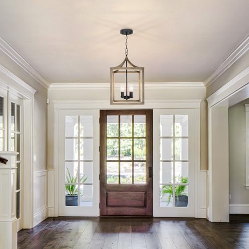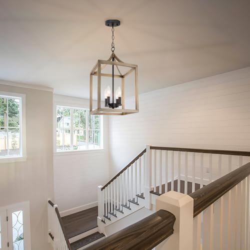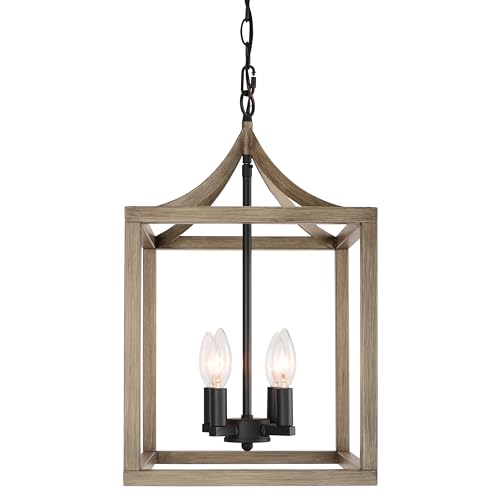 4-Light Farmhouse Chandelier – Industrial Lantern Ceiling Fixture with Painted Wood Metal Cage, Geometric Pendant Chandeliers Light for Entryway, Foyer, Kitchen, E12 Base