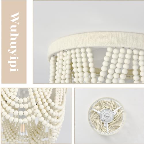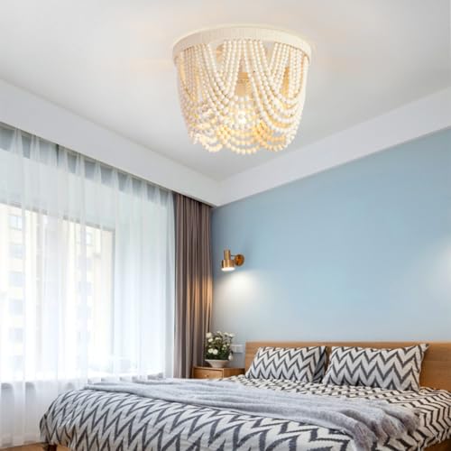 Boho Wood Beaded Chandelier,LED Flush Mount Ceiling Light,Farmhouse Rustic White Hemp Rope Chandeliers Fixture for Bedroom,Drawing Room,Kitchen, Entryway,Dining Room(3-Light)