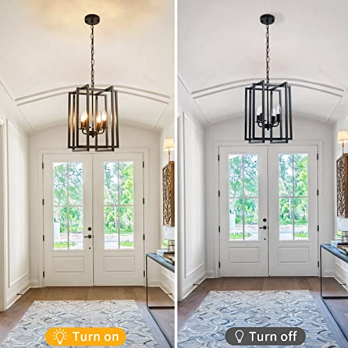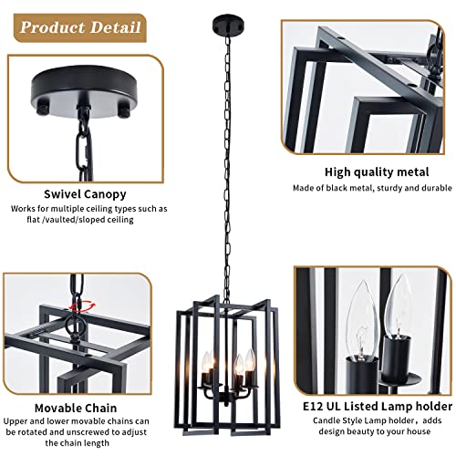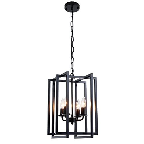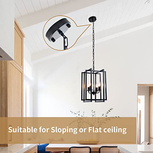 Farmhouse Lantern Chandelier Light Fixture Black, 4-Light Rustic Industrial Pendant Lighting, Adjustable Height Modern Square Cage Hanging Lights for Hallway Kitchen Island Living Room Bedroom
