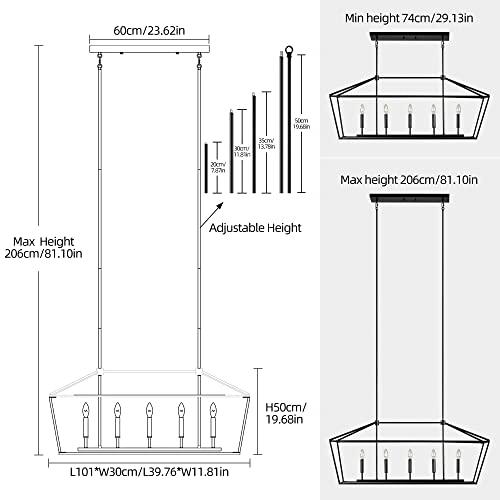 💡【Black Farmhouse Chandelier Exquisite Structure】Chandelier dining roomMetal construction, Lamp body is 32″ in diameter and 19″ high, adjustable hanging pole total length: 68″, 2 pairs of rods (3×12”+ 1×6”+ 1×3”) for you to choose the height from ceiling, good for high or low ceiling, and the stem can be tilted up to 90°, available for both sloped and flat ceilings.