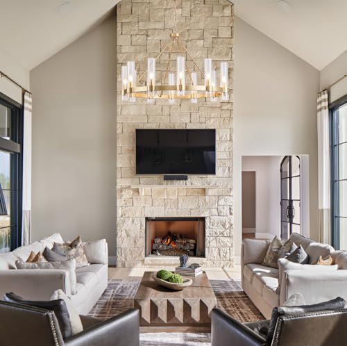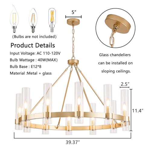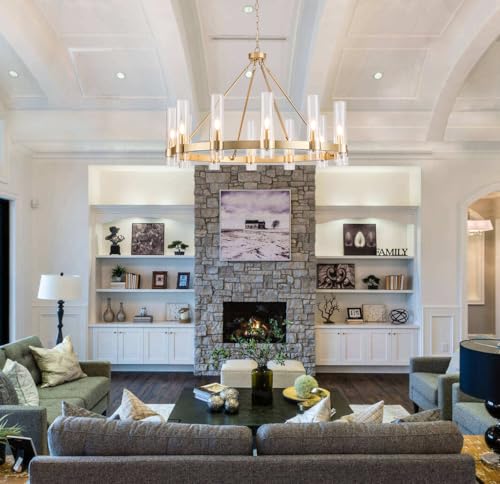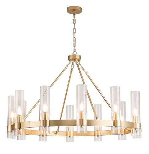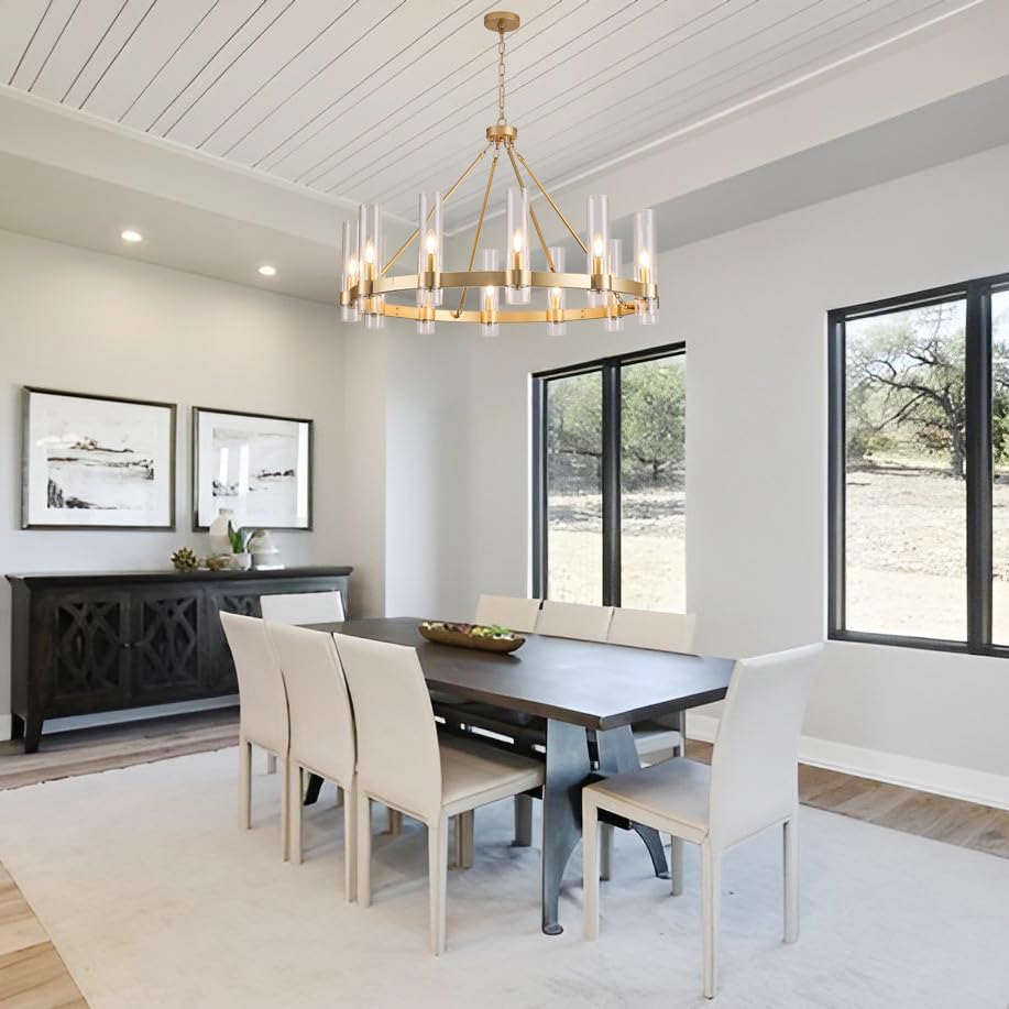 Wagon Wheel Chandelier, 12-Light Golden Farmhouse Round Chandelier, Industrial Lighting fixtures, Glass Chandelier, Suitable for Porch, Dining Room, Living Room, and Bedroom.