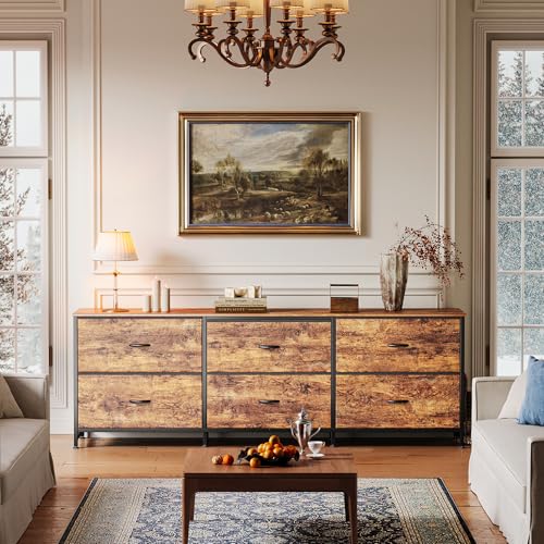 Huuger 63 Inch Long Dresser for Bedroom, Wide TV Stand for 55, 65, 70 Inch TV, 6 Drawer Dresser for Closet with Fabric Drawers, Storage Organizer for Bedroom, Entryway, Rustic Brown