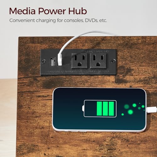 Media Charging Hub: Our TV stand for living room has a versatile power strip featuring 2 standard outlets and 2 USB Type-A ports, seamlessly powering your media devices. Say goodbye to the hassle of searching for outlets and tangled wires