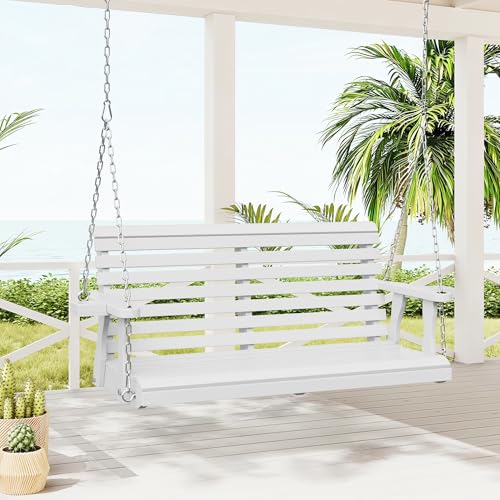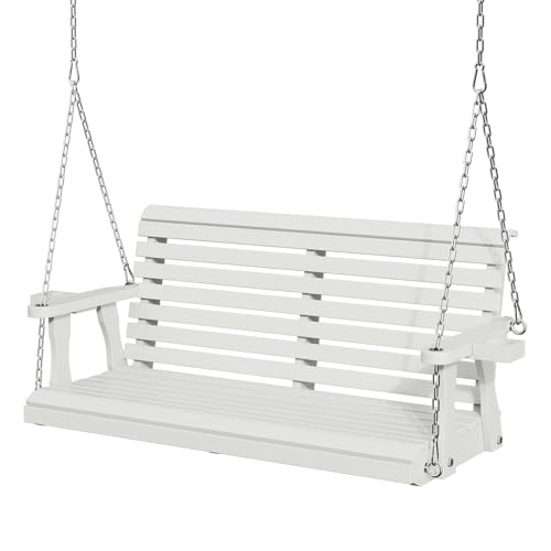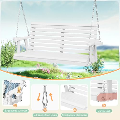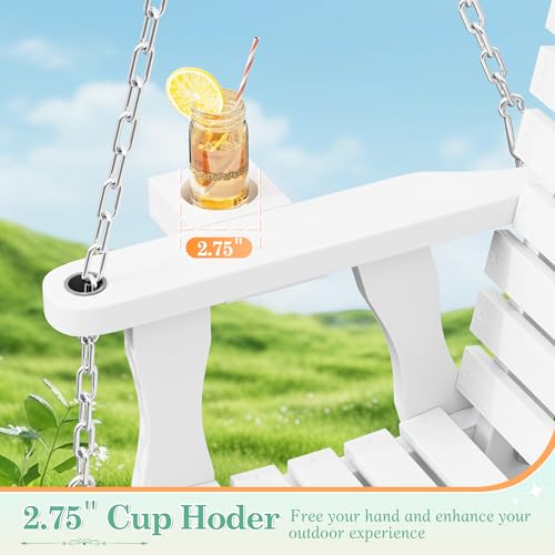 Crownland Outdoor Wooden Porch Swing, 2 Seat Patio Swing Bench with Cup Holders, Hanging Porch Bench Swing with Hanging Chains for Patio Garden Yard(White)