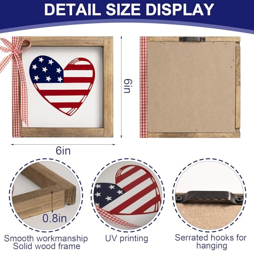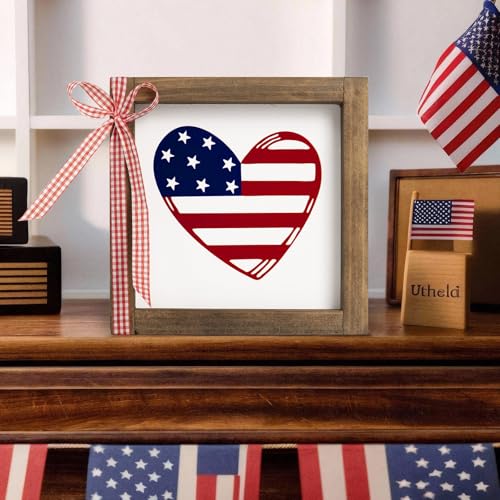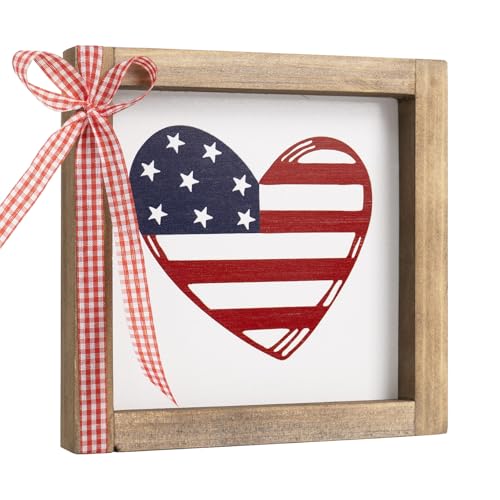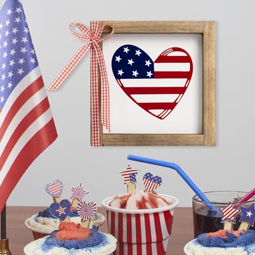 4th of July Sign, Wooden Patriotic Wall Art Decor with Wood Frame, Indoor Americana Independence Day Table Shelf USA Decorations in Red White and Blue for Home