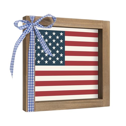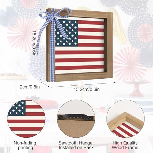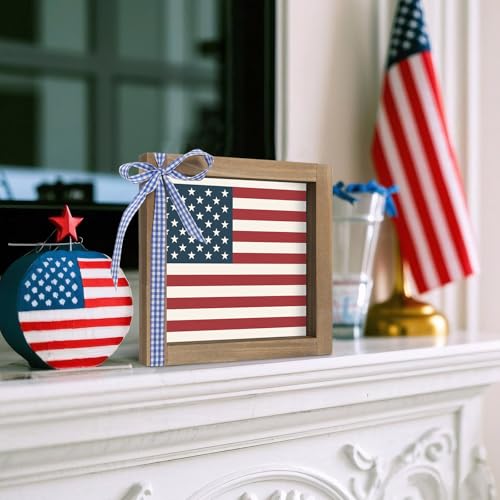 America Flag Sign, 6×6 Inch Rustic Wood Framed 4th of July Independence Day Patriotic Decor, Americana Decoration for Home Office Table Desk Tiered Tray