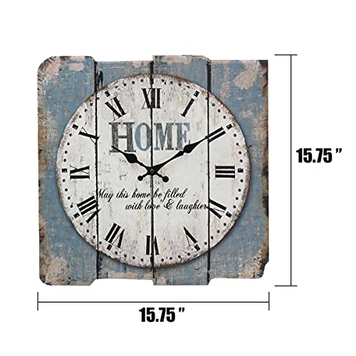 Add a touch of vintage flare to your home decor with Stonebriar’s square 15″ rustic farmhouse worn blue and white Roman numeral battery operated wall clock. This clock features a worn white clock face print with a worn blue wooden background for a farmhouse or shabby chic decor look. The face of this clock has an antique inspired design that has been slightly distressed with black Roman numerals. Clock also comes with attached keyhole hangers for easy installation. Clock measures 15.7 inches in length and 15.7 inches in height. It is the perfect size for over the mantel or as an accent for your kitchen, bedroom, or living room. Stonebriar’s vintage clock is battery operated and requires a single AA battery (not included). Buy your Stonebriar rustic antique farmhouse wall clock for yourself or give it as a gift for Christmas, birthdays, and housewarmings.